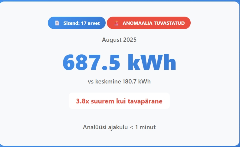 August 2025 tarbimine (687.5 kWh) erineb drastiliselt tavalisest mustrist, olles üle kolme korra suurem järgmise suurima kuu omast. See võib viidata: